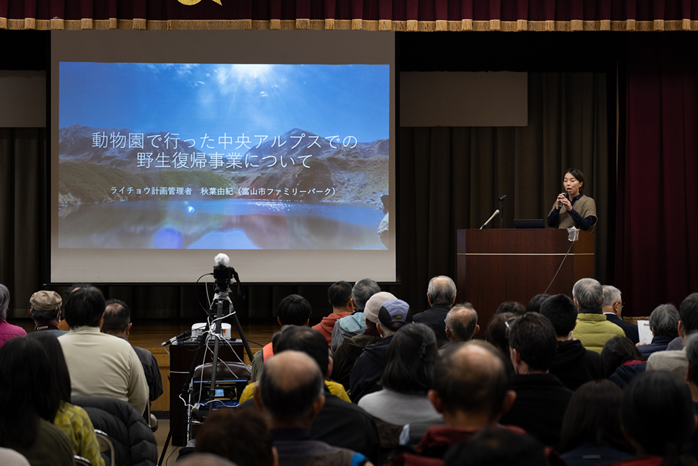 続いて報告2では、日本動物園水族館協会ライチョウ計画管理者の秋葉由紀さんが「動物園で実施した野生復帰事業について」と題し、動物園で人の手で育てたライチョウを山に運び、現地の環境に慣らした後に放鳥することで、復活に貢献したことを話されました(写真7)。
