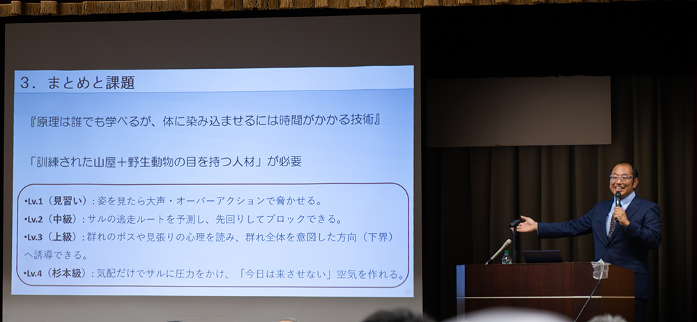 報告3は、株式会社ウイルアクトの杉本淳さんによる「中央アルプスで実施したサルの追い払い」です(写真8)。わずか4年間の追い払いで、中央アルプスにサルは夏にほとんど上がって来なくなり、2025年にはその追い払い技術を使って北アルプス燕岳から、大天井岳、常念岳にかけてのサルの追い払いも行ったことが報告されました。