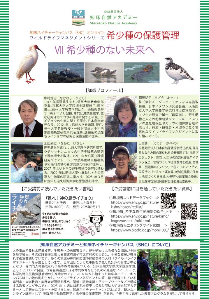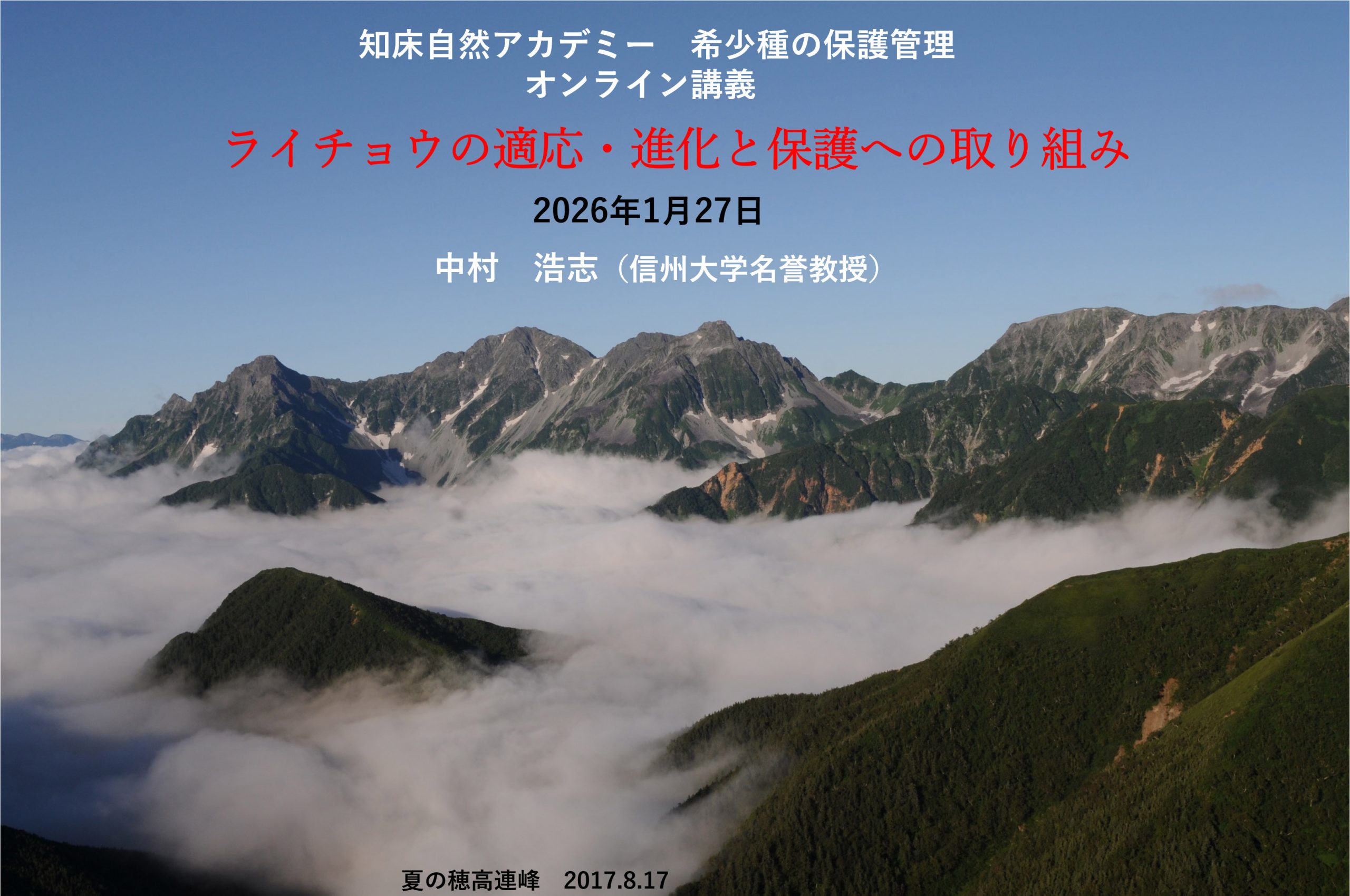 公益財団法人 知床自然アカデミーが主催するワイルドライフマネージメントシリーズ「希少種の保護管理」の講座がZoomで公開されています。これまでにI. シマフクロウ編、II. オオワシ・オジロワシ編、III. タンチョウ編、IV. 海鳥編、V. 猛禽類編、VI. 鰭脚類・ラッコ編の講座が終わり、その総括となる最終編「VII. 希少種のいない未来へ」が2026年1月からスタートします(詳しくはチラシをご覧ください)。
